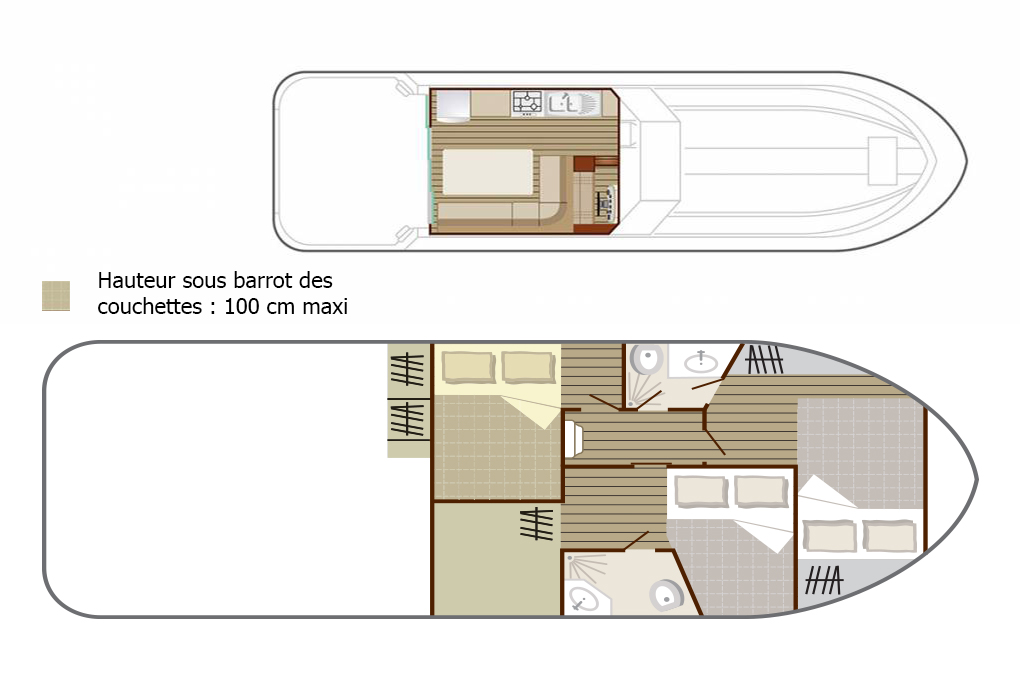 Le Nicols 1010 de la gamme Sedan est un bateau fluvial idéal pour 1 famille, ou 2 couples et 2 enfants : il est composé de 3 cabines doubles (dont une avec hauteur sous barrot 100 cm environ au-dessus du couchage) et de 2 salles de bain qui offrent un confort suffisant pour un équipage de 6 personnes.