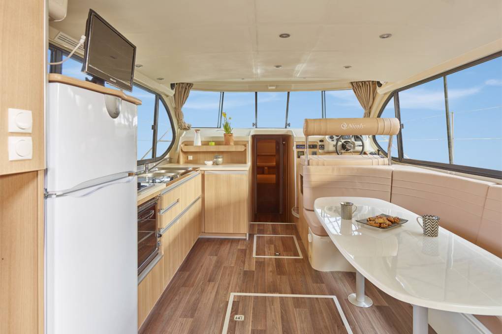 Suggestion : si les bateaux Nicols ne bénéficient pas du label "accueil handicap", certains de nos modèles sont plus appropriés que d'autres pour accueillir les personnes à mobilité réduite. Ainsi, les gammes Estivale et Fly sont accessibles par l'arrière, via un large portillon. En amarrant le bateau par la poupe, il est donc aisé de passer du ponton à la terrasse arrière en fauteuil roulant. Cette terrasse arrière est de plain pied avec le séjour, accessible via une large baie vitrée : là encore, un accès possible pour un fauteuil. Le séjour offre l'espace cuisine, l'espace déjeuner, et une banquette convertible en lit double. Le couchage est donc possible dans cet espace de vie ; à noter toutefois que pour rejoindre les toilettes, douches, et autres cabines de nuit, il faut emprunter un couloir d'enivron 60 cm de large et accessible généralement via 2 à 3 marches : l'idéal est donc que la personne à mobilité réduite puisse à minima se lever, seule ou accompagnée, afin d'effectuer les quelques pas nécessaires pour rejoindre les sanitaires.